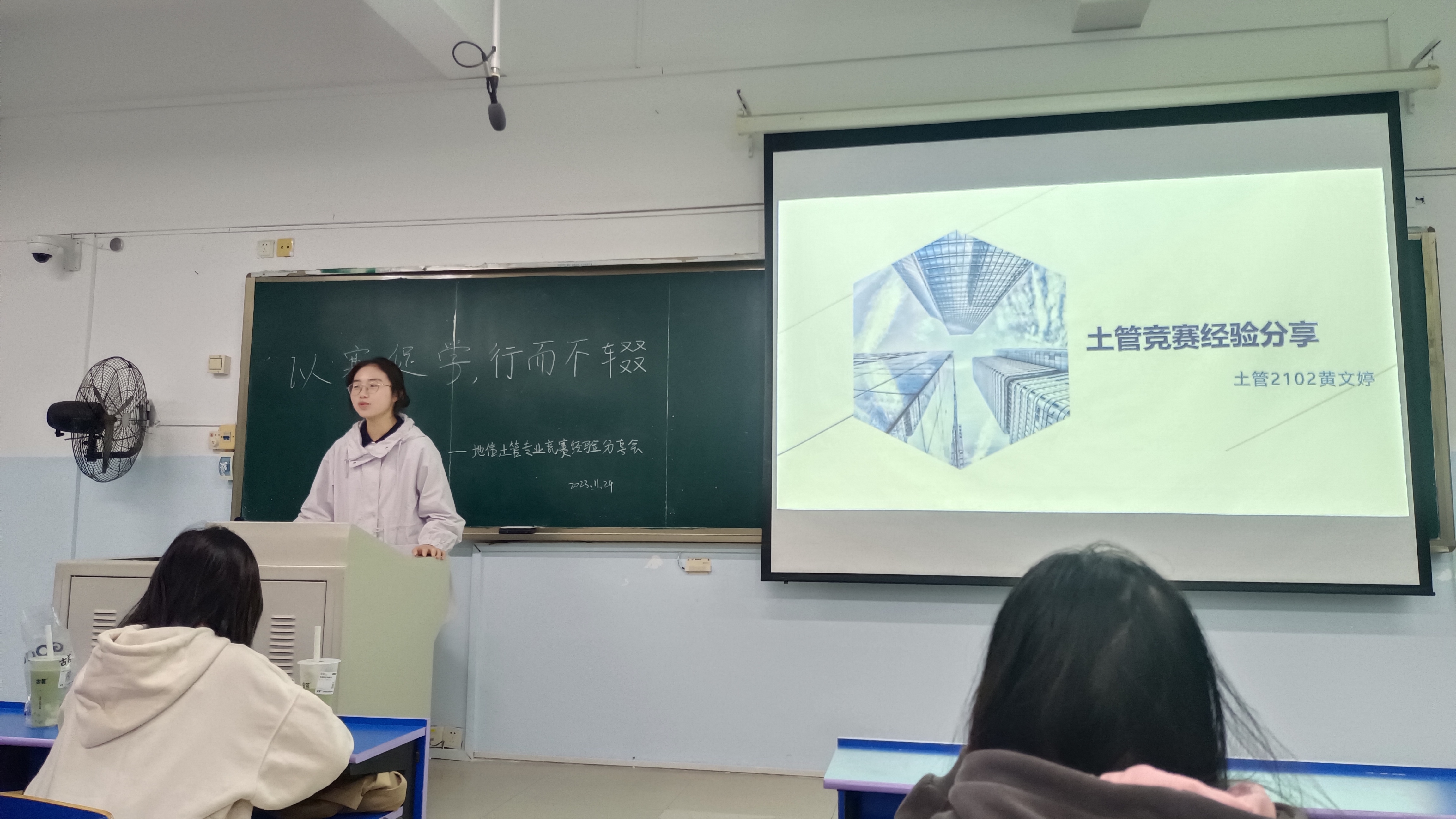 地信2001邵伊雯对地信专业的易智瑞杯中国老员工GIS软件开发以及一些国家级的比赛做了一个完整的介绍以及就比赛前准备和比赛中过程提出了一些建议,例如赛前可以先确定比赛主题,之后确定相应的思路,再做一些数据准备,在比赛时做好数据预处理,运用合理的方法以及编程代码或3D模型;地信2101毕晨铭则对比赛的整个过程阶段分享了自己的经验,以及比赛对于综测保研的加分的重要性;土管2101徐婧仪明确参与竞赛的目的,并分享了自己参加土地国情调查大赛时的亲身经历;土管2102黄文婷则介绍熟练的掌握办公软件,拥有强大的心理承受能力,随机应变的能力和组织协调能力等对比赛的重要性。土管2102林璟杰就各类学科比赛时间安排做了介绍,也分享了自己的参赛感悟。