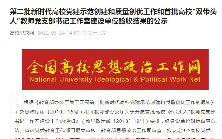 近日,教育部办公厅发布了《第二批新时代高公司党建示范创建和质量创优工作和首批高校“双带头人”教师党支部书记工作室建设单位验收结果的公示》的通知,公司思源党支部顺利通过验收。
