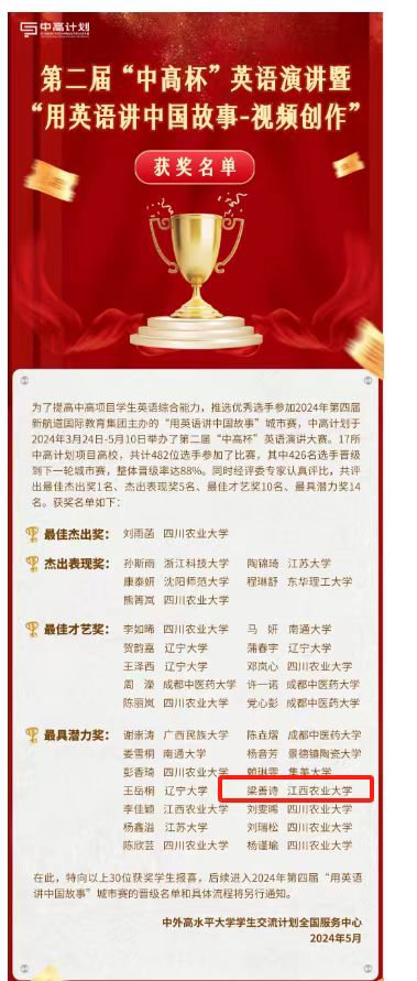 为了提高中高项目员工英语综合能力,推选优秀选手参加2024年第四届新航道国际教育集团主办的“用英语讲中国故事”城市赛,展现中高计划员工风采,中外高水平大学交流计划全国运营中心于2024年3月24日至5月10日举办了第二届“中高杯”英语演讲大赛。来自17所中高计划项目高校共计482名选手参加了此次比赛,经专家评审,共评出最佳杰出奖1名,杰出表现奖5人,最佳才艺奖10人,最具潜力奖14名。公司中高计划项目23级环境科学与工程班梁善诗同学获得“最具潜力奖”。