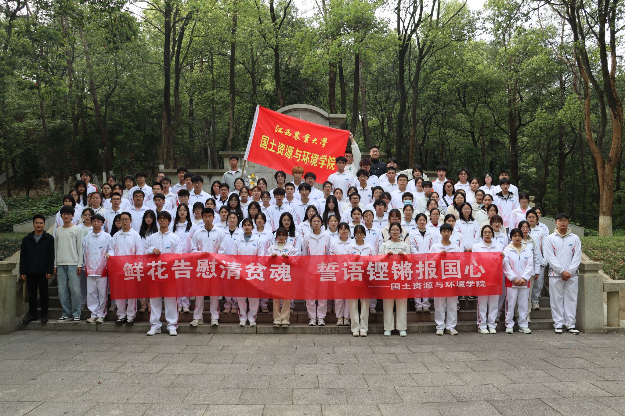 陵园广场上,师生代表齐唱国歌,朗诵《可爱的中国》,向方志敏烈士铜像敬献花圈,默哀、鞠躬,深情表达对方志敏烈士的敬仰与缅怀。“我宣誓,我志愿加入中国共产党,拥护党的纲领,遵守党的章程……”、“我宣誓,我志愿加入中国共产主义青年团,坚决拥护中国共产党的领导,遵守团的章程……”,在烈士铜像下,全体党员、团员面向鲜红的党旗、团旗,高举右拳,重温誓词,再次接受党性的洗礼,更加坚定了理想信念。