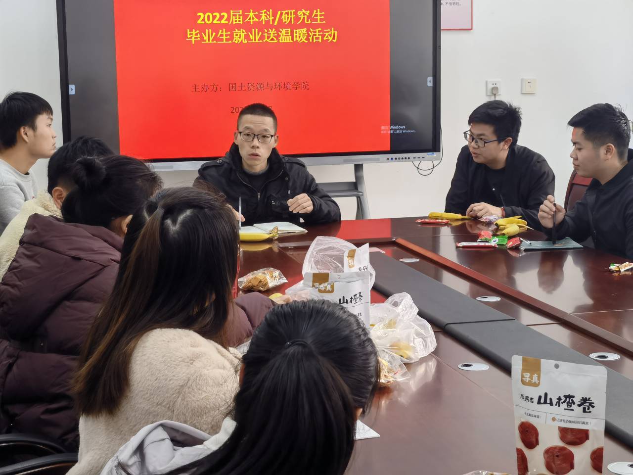 2021年12月07日下午14:30,国土院院办会议室203举行2022届毕业生(本科、研究生)就业指导活动,为国土院求职学子送上冬日的温暖,助力学子建功立业。国土公司党委副书记马慧琴、院团委书记江仔媛老师,学工办主任张勇老师、2022届求职本科毕业生、研究生参加本次活动。公司党委副书记马慧琴老师主持本次活动,马书记表示,公司2021届本科毕业生实现全校就业去向落实率第三,研究生就业去向落实率100%,成功实现公司就业由大院转为较强院的状态。