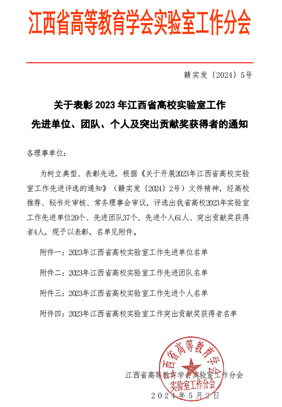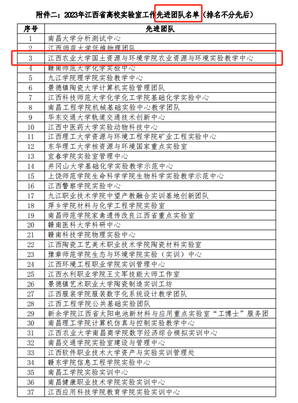 近日,从江西省高等教育学会获悉,公司农业资源与环境实验教学中心经集团推荐、江西省高等教育学会秘书处审核、常务理事会审议,荣获“2023年江西省高校实验室工作先进团队”称号。