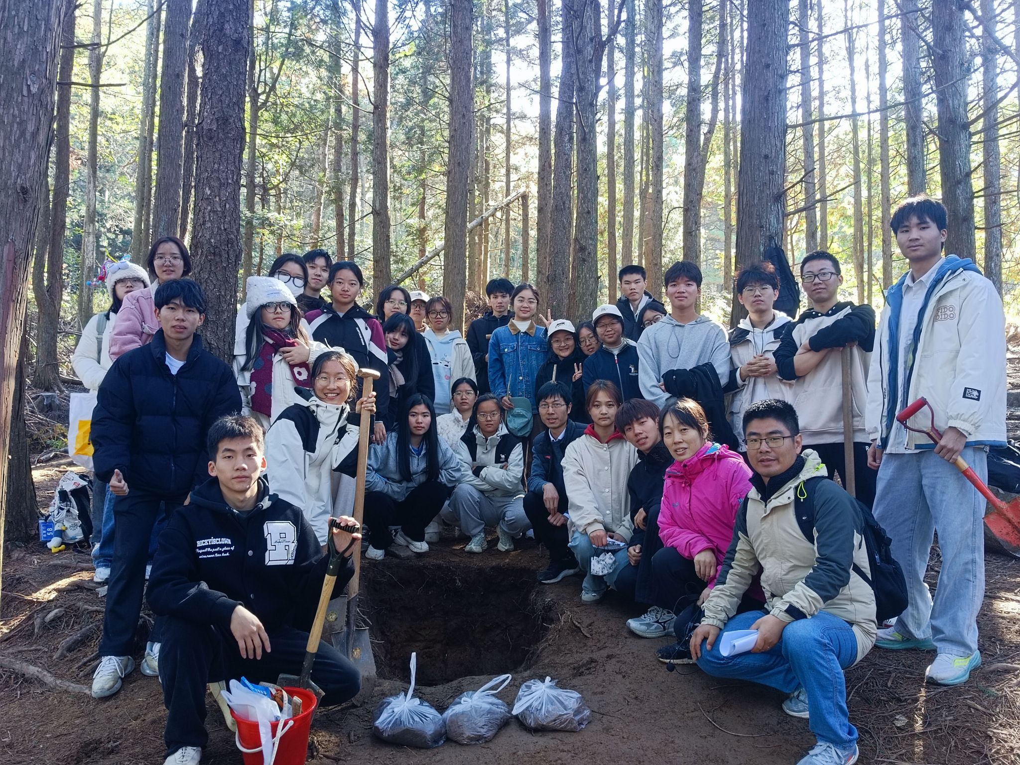 10月30日,同学们随指导老师来到海拔1020米左右的芦林饭店附近的山地黄壤开展土壤调查与采样。该土壤相较于红壤,所处气候条件温度低,湿度大。在老师的指导下,同学们挖掘土壤剖面并划分剖面层次(包括枯枝落叶层、腐殖质层、淋溶层及淀积层),并现场分析部分土壤理化性质,如用色卡判定了土壤颜色,用土壤刀感受土壤紧实度,用pH混合指示剂测定土壤酸碱度,双手触摸感知土壤干湿度和质地等。同学们在剖面中发现了土壤动物(蚯蚓、蚂蚁等)以及新生体(胶膜、铁锰结核和铁锰斑纹)等。10月31日,同学们随指导老师来到海拔约1239米的大月山水库边的人工针叶柳杉林的山地棕壤剖面调查与采样。山地棕壤具有较厚的有机质层,分布于海拔1200米以上的山地,原生植被为落叶阔叶林,现为人工针叶柳杉林,母岩为石英砂岩,母质主要为残坡积物。同学们采集剖面层次的土壤样品带回实验室做进一步的理化性质分析。在此过程中,同学们相互配合,互相交流分享学习经验,对土壤奥秘有了深入的理解。