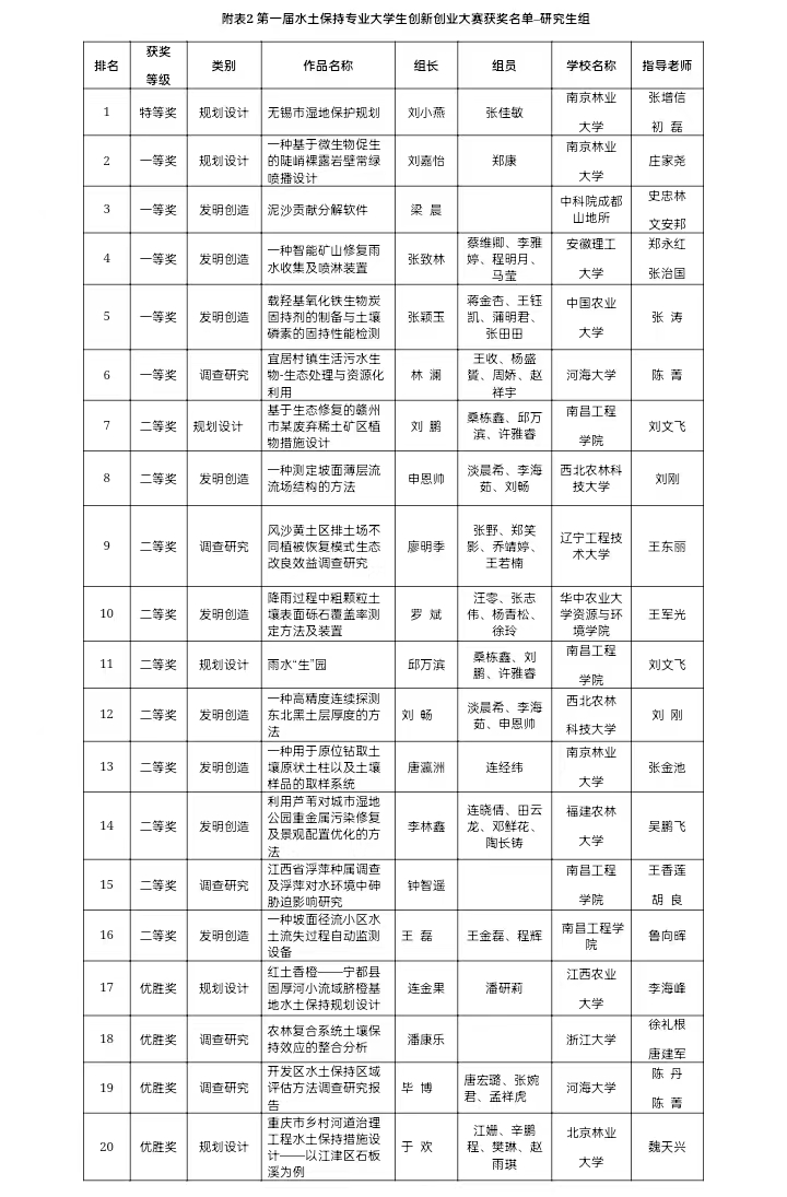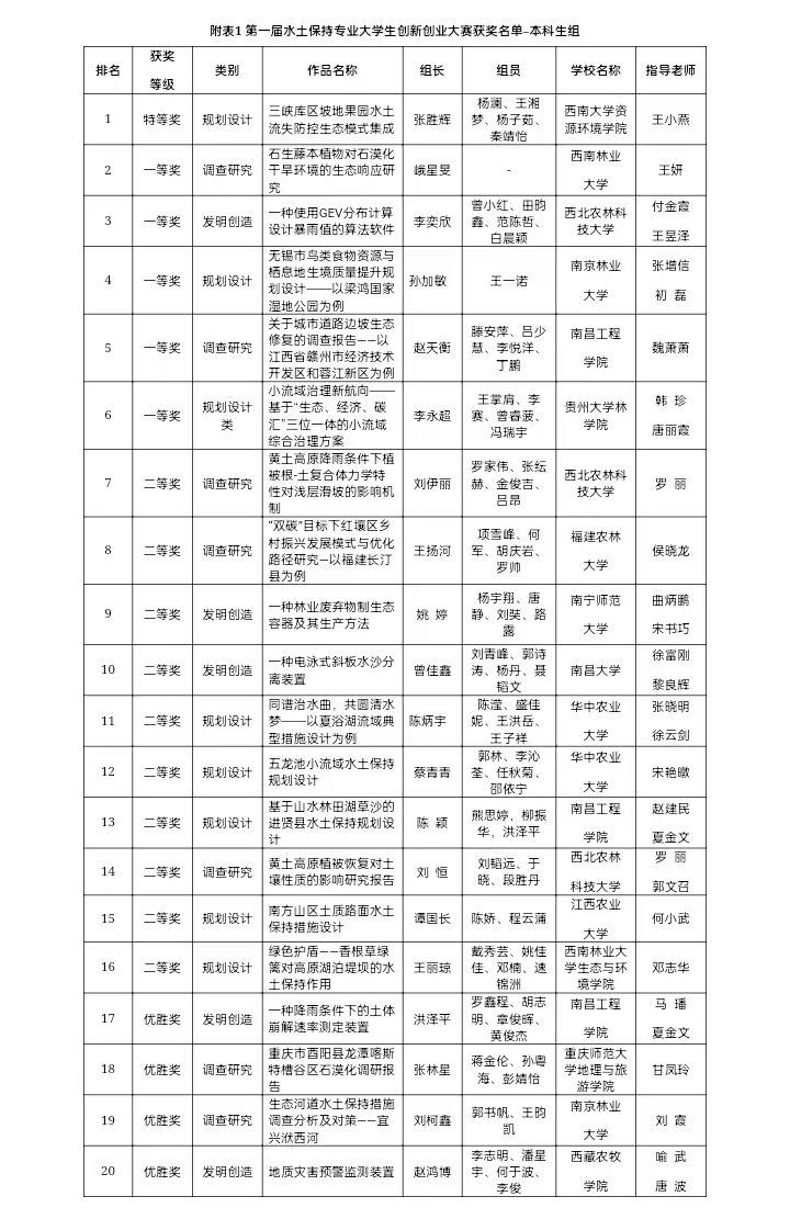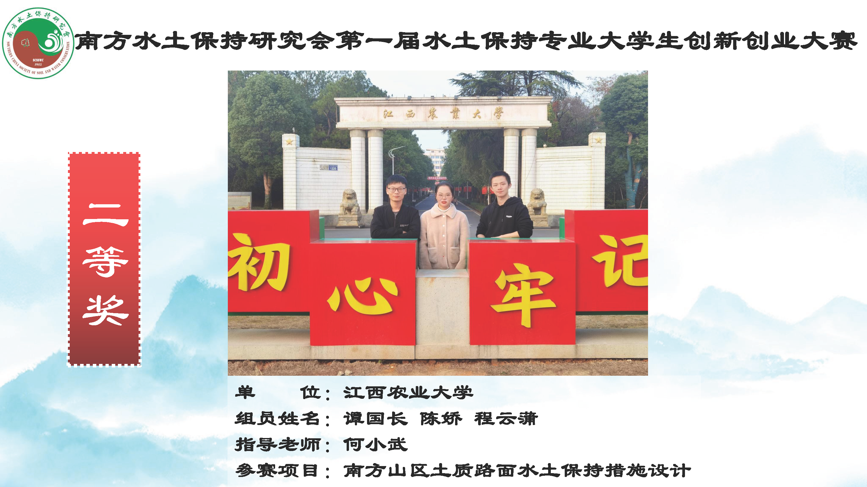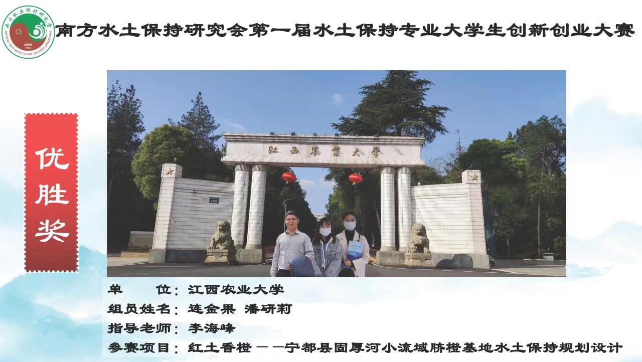 2022年12月3日,南方水土保持研究会第一届水土保持专业老员工创新创业大赛颁奖仪式以线上形式成功举行,历时半年多的大赛圆满落幕。由公司员工谭国长、陈娇、程云蒲(指导老师:何小武)完成的参赛作品《南方山区土质路面水土保持措施设计》荣获本次大赛本科生组“二等奖”,公司员工连金果、潘研莉(指导老师:李海峰)完成的参赛作品《红土香橙——宁都县固厚河小流域脐橙基地水土保持规划设计》荣获大赛研究生组“优胜奖”。