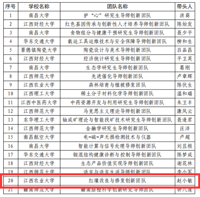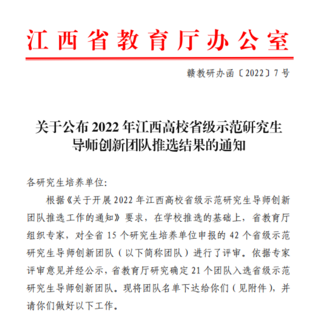 近日,江西省教育厅下发了《关于公布2022年江西高校省级示范研究生导师创新团队推选结果的通知》(赣教研办函〔2022〕7号),公司赵小敏教授领衔的“红壤改良与修复创新导师创新团队”成功获批入选江西省省级示范研究生导师创新团队。