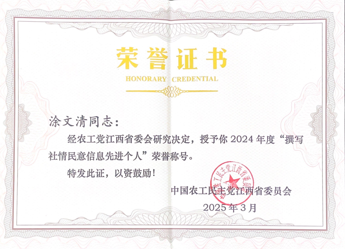 近日,中国农工民主党江西省第十三届委员会第四次全体会议在南昌召开。会议表彰了2024年度农工党江西省市级组织综合评价先进集体、“优秀支部”评选工作和反映社情民意信息工作先进集体、先进个人。PA视讯官网经理、省政协常委、农工党江西省委会委员涂文清荣获“撰写社情民意信息先进个人”称号。
