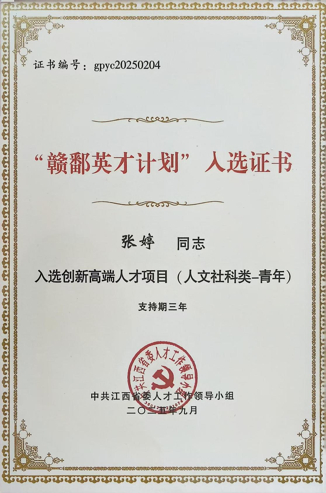 近日,中共江西省委人才工作领导小组公布了2025年度“赣鄱英才计划”评选结果。公司土地资源管理系张婷老师成功入选该计划的创新高端人才项目(人文社科类—青年)。