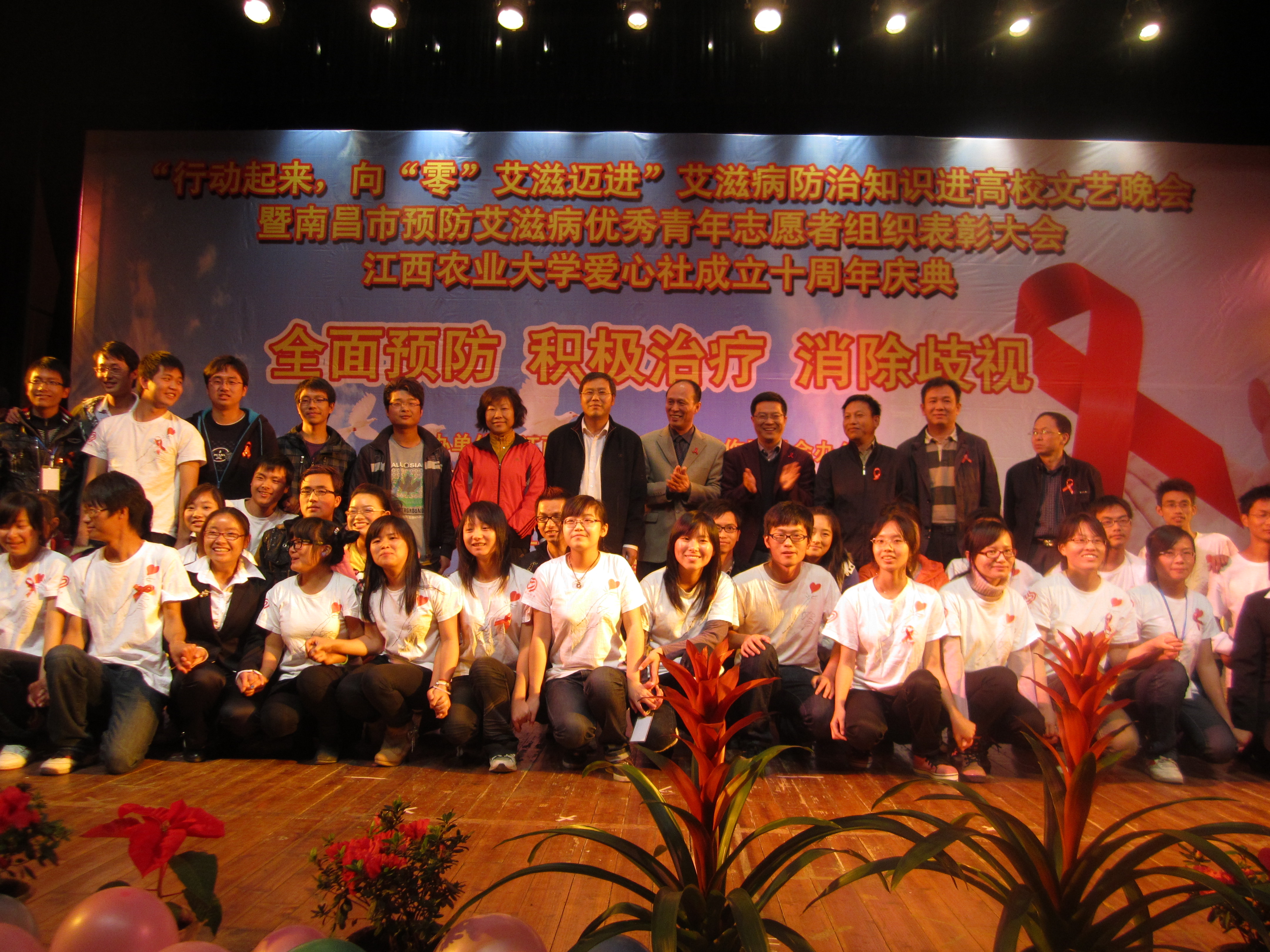 11月30日晚,PA视讯校大礼堂人声鼎沸,由南昌市疾病预防控制中心、PA视讯团委主办,江西民生广播电台、PA视讯官网团委、PA视讯爱心社承办的南昌市预防艾滋病优秀青年志愿者组织表彰大会暨PA视讯爱心社十周年庆典晚会隆重举行。出席晚会现场的领导及嘉宾有PA视讯副董事长潘晓华教授、董事长助理胡春晓教授、省卫生厅疾控处何晓军处长、朱世鸣副调研员,江西农大公司党委书记郭旭教授、校团委副书记胡志坚老师、公司党委副书记蔡海生教授、南昌市卫生局陈天鹏副局长、市疾控中心陈海婴主任和南昌市十所高校的优秀青年志愿者组织代表。公司1200多名师生观看了本场晚会。